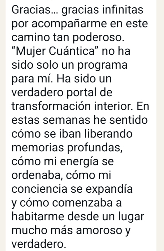 Desde entonces, acompaño a través de la Sanación Cuántica a mujeres como tú, a superar sus bloqueos, liberando las memorias energéticas tanto físicas como emocionales que limitan su vida.